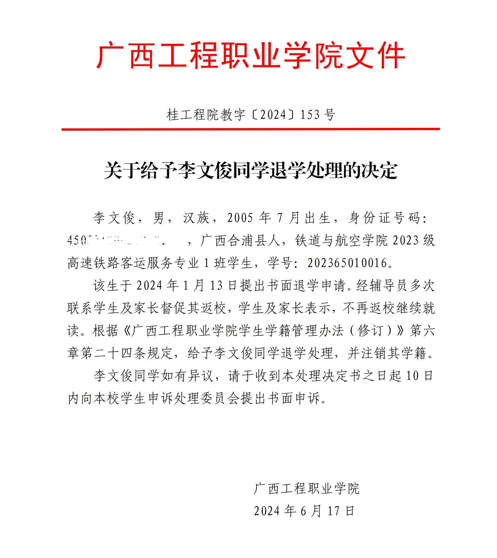 根據(jù)《普通高等學(xué)校學(xué)生管理規(guī)定》(教育部令第41號(hào))、《廣西工程職業(yè)學(xué)院學(xué)生學(xué)籍管理辦法(修訂)》第二十四條規(guī)定,給予李文俊同學(xué)退學(xué)處理,并注銷其學(xué)籍。