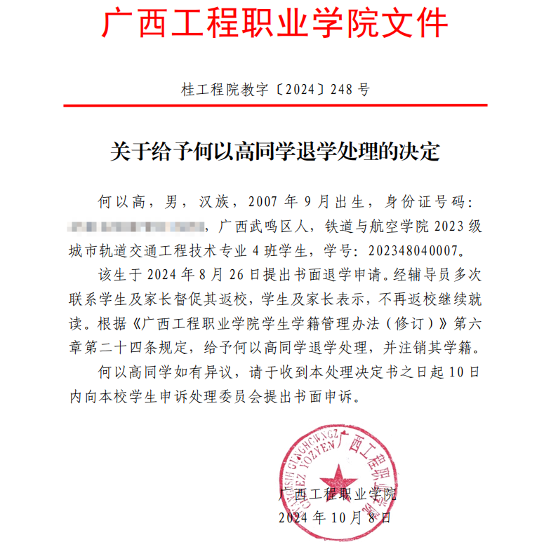 根據(jù)《普通高等學(xué)校學(xué)生管理規(guī)定》(教育部令第41號)、《廣西工程職業(yè)學(xué)院學(xué)生學(xué)籍管理辦法(修訂)》第二十四條規(guī)定,給予何以高同學(xué)退學(xué)處理,并注銷其學(xué)籍。