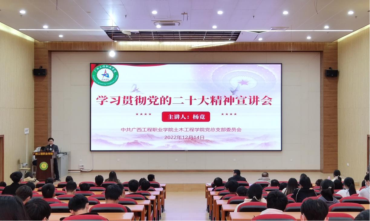 2022年12月14日,土木工程學(xué)院黨總支在圖文信息大樓三樓學(xué)術(shù)報告廳,召開學(xué)習(xí)宣傳貫徹黨的二十大精神宣講會。土木工程學(xué)院黨總支書記楊竟同志向土木工程學(xué)院教師黨員、學(xué)生黨員、入黨積極分子、學(xué)生干部作黨的二十大精神宣講。