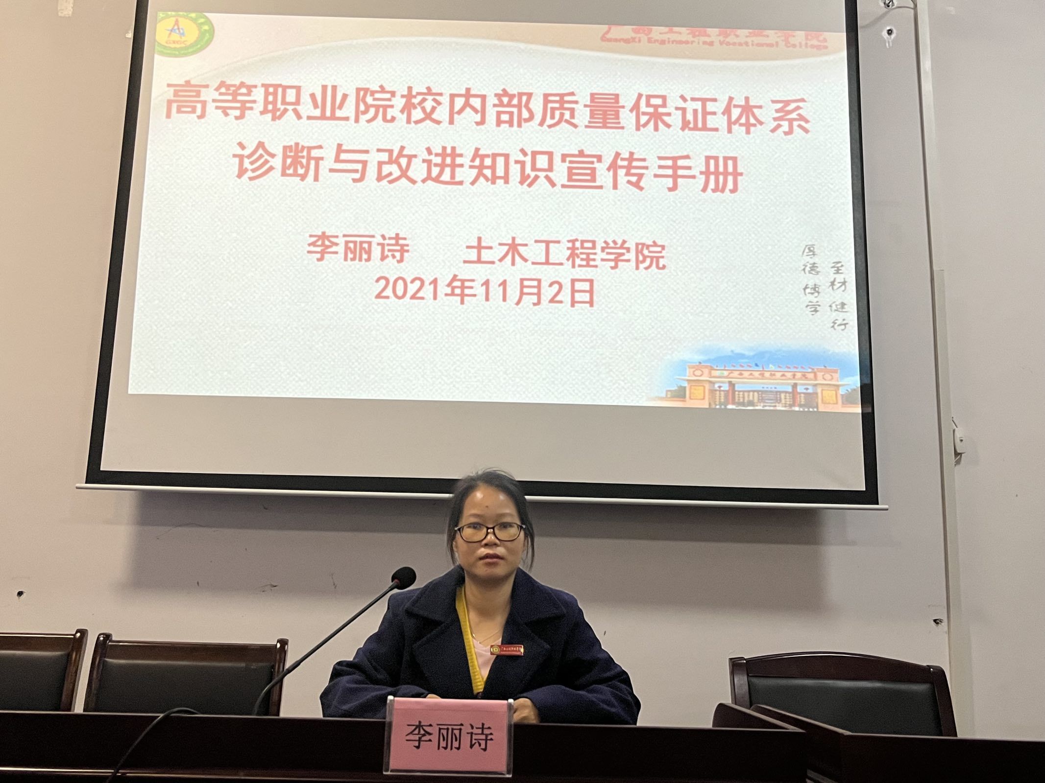 會議緊接著,由土木工程學院李麗詩副院長對2021年學校年檢工作動員及對本部門年檢工作進行任務(wù)分解,給全體參會教職工作《高等職業(yè)學校內(nèi)部質(zhì)量保證體系診斷與改進學習手冊》業(yè)務(wù)培訓。