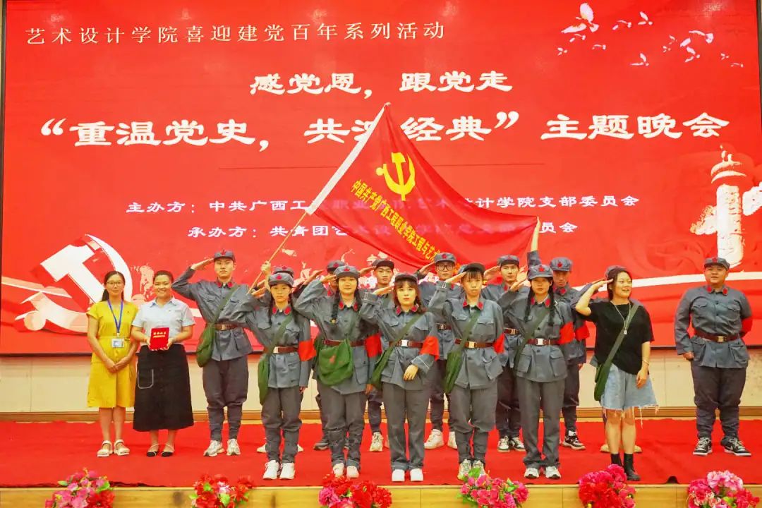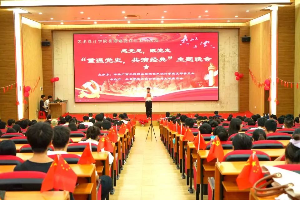 2021年6月8日晚,藝術(shù)設(shè)計(jì)學(xué)院在圖文信息大樓一樓學(xué)術(shù)報告廳舉辦了聽黨話、感黨恩、跟黨走——“重溫黨史,共演經(jīng)典”主題晚會。出席晚會現(xiàn)場的領(lǐng)導(dǎo)有學(xué)校副校長林萌,藝術(shù)設(shè)計(jì)學(xué)院黨支部書記、副院長覃鳳姣,黨支部委員陸閑,黨支部委員、辦公室主任王艷,分團(tuán)委書記潘翠萍,教研室主任李花,黨支部全體師生黨員、黨員發(fā)展對象、入黨積極分子等也觀看了本次晚會。