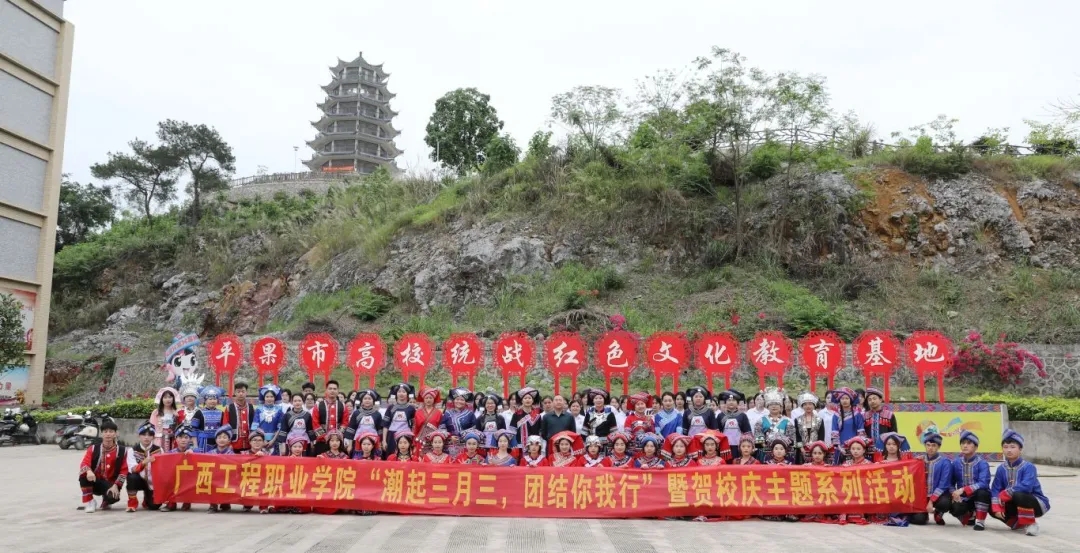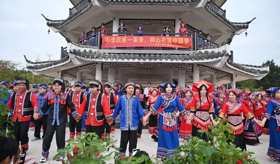 4月9日,學校師生身穿民族服飾,相聚工程塔,唱山歌,拋繡球,感受多彩民族風情,同慶“廣西三月三”民族傳統(tǒng)節(jié)日。黨委書記、督導專員蒙本曼等校領導參加了活動。