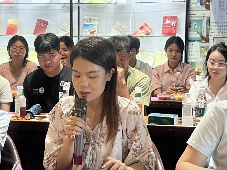 圖為黨支部書記覃鳳姣老師做座談會(huì)總結(jié)