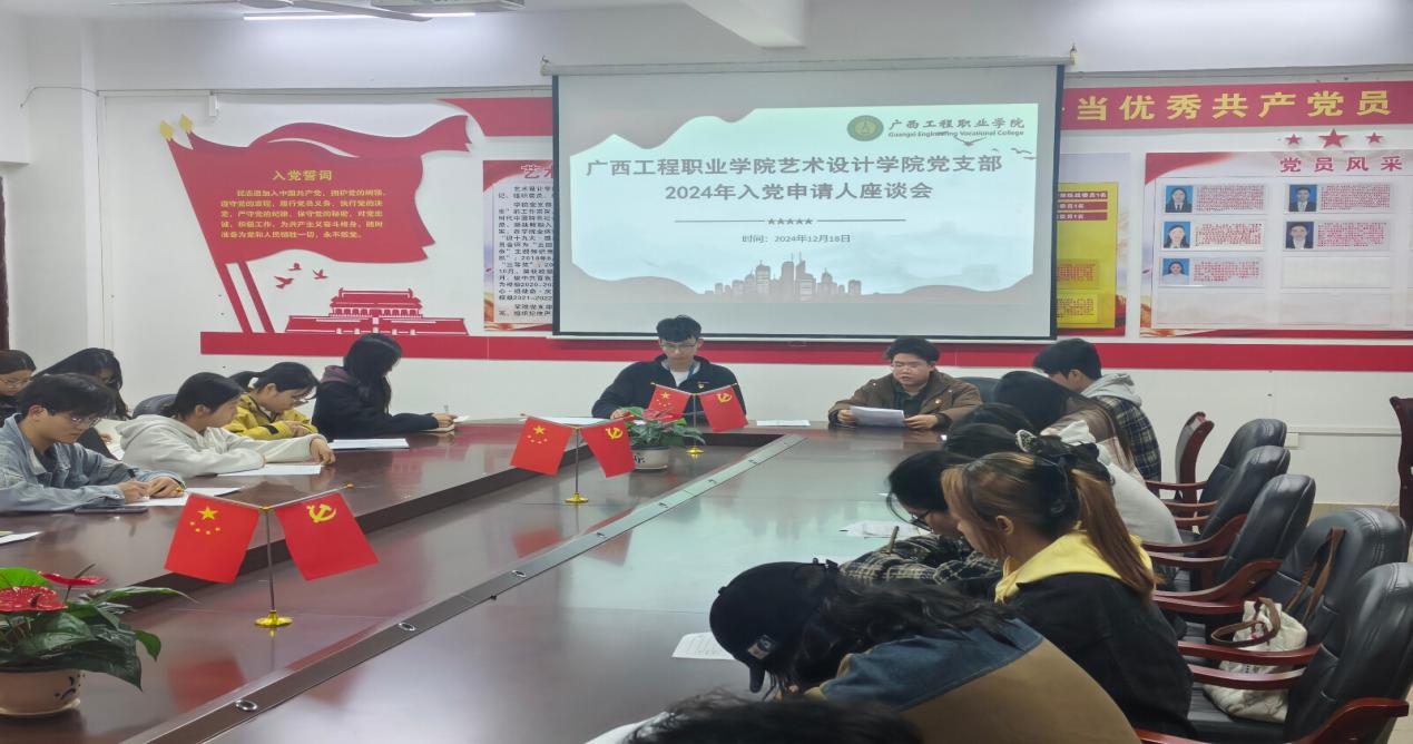 2024年12月18日晚上,藝術(shù)設(shè)計學(xué)院黨支部在學(xué)院三樓黨員活動室召開2024年下半年入黨申請人座談會。學(xué)院黨支部副書記趙志輝、宣傳兼統(tǒng)戰(zhàn)委員曹遠翔出席了本次座談會,與入黨申請人進行了交流。此次座談會旨在深入了解入黨申請人的思想動態(tài)、政治覺悟及入黨動機,為黨組織把好黨員入口關(guān)。