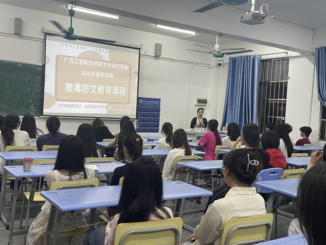 圖為黃玉瑩老師為2024級(jí)美容美體藝術(shù)專業(yè)和建筑設(shè)計(jì)專業(yè)進(jìn)行禁毒和防艾知識(shí)講解