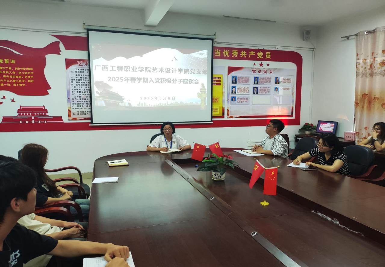 2025年5月8日下午,藝術(shù)設(shè)計(jì)學(xué)院黨支部在學(xué)院三樓黨員活動室召開2025年春學(xué)期入黨積極分子座談會。學(xué)院黨支部書記覃鳳姣、副書記趙志輝、宣傳兼統(tǒng)戰(zhàn)委員曹遠(yuǎn)翔老師出席本次座談會,與入黨積極分子展開交流。此次座談會旨在進(jìn)一步加強(qiáng)入黨積極分子的培養(yǎng)教育,引導(dǎo)青年學(xué)子堅(jiān)定理想信念、勇?lián)鷷r(shí)代使命。