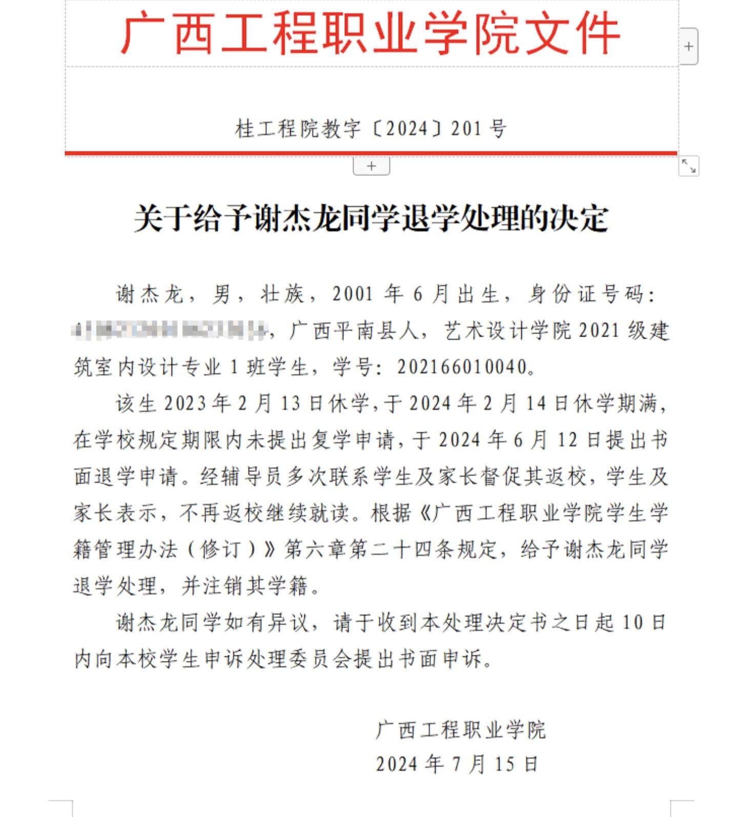 根據(jù)《普通高等學校學生管理規(guī)定》(教育部令第41號)、《廣西工程職業(yè)學院學生學籍管理辦法(修訂)》第二十四條規(guī)定,給予謝杰龍同學退學處理,并注銷其學籍。