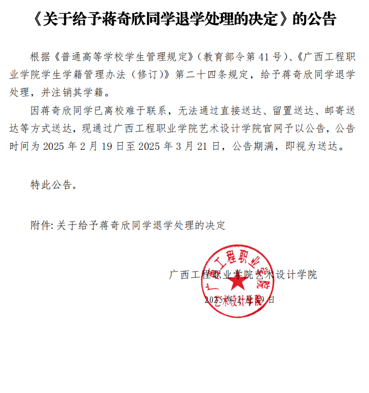 上一篇:《關(guān)于給予韋俊杰同學(xué)退學(xué)處理的決定》的公告