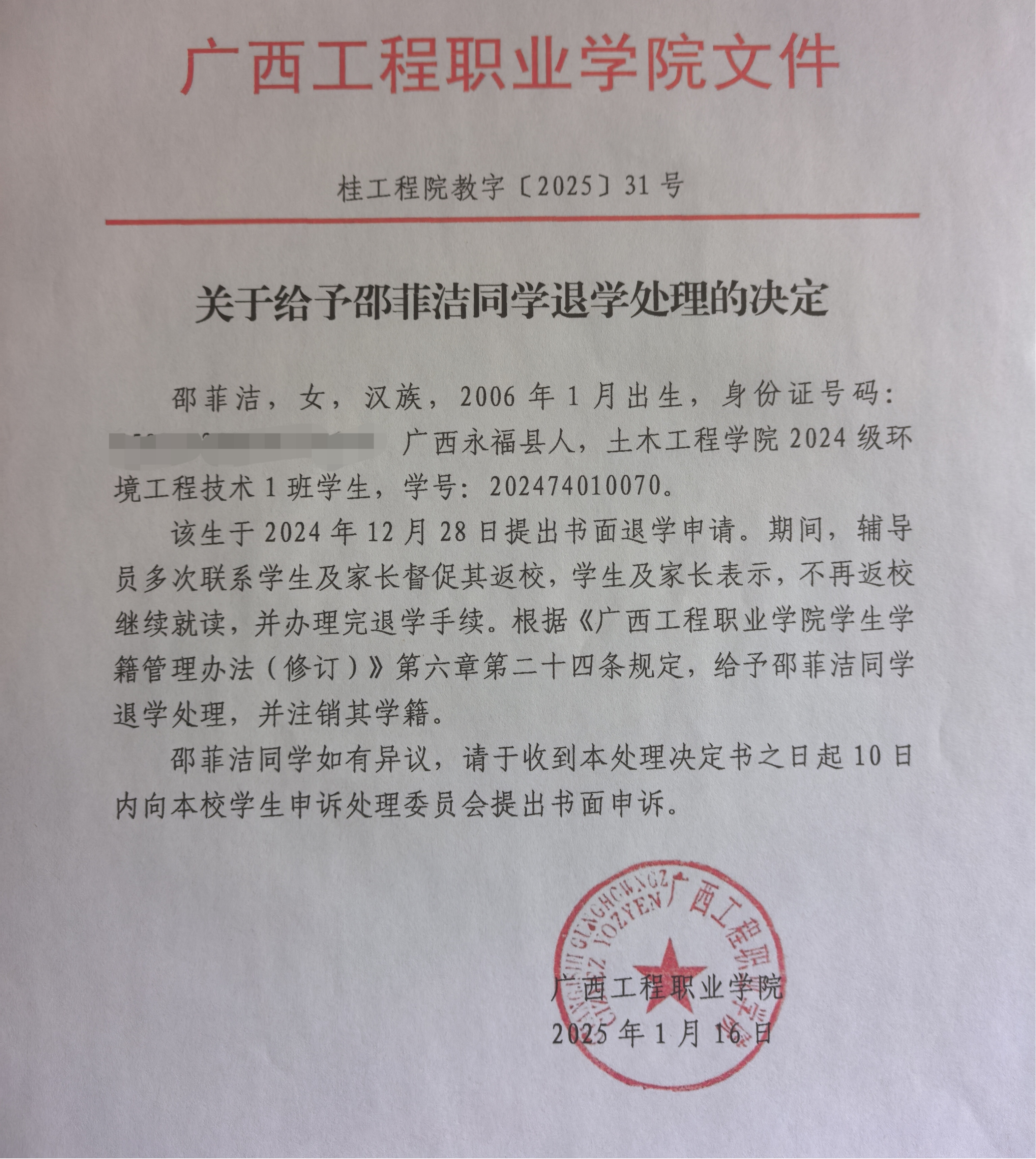 根據(jù)《普通高等學(xué)校學(xué)生管理規(guī)定》(教育部令第41號(hào))、《廣西工程職業(yè)學(xué)院學(xué)生學(xué)籍管理辦法(修訂)》第二十四條規(guī)定,給予邵菲潔同學(xué)退學(xué)處理,并注銷(xiāo)其學(xué)籍。