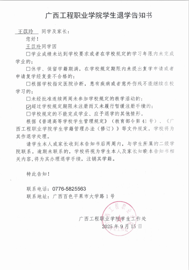 王苡玲,女,學(xué)號(hào):202466020055,藝術(shù)設(shè)計(jì)學(xué)院2024級(jí)建筑室內(nèi)設(shè)計(jì)2班學(xué)生;于2025年8月31日開(kāi)學(xué)至今未返校,超過(guò)學(xué)校規(guī)定期限未注冊(cè)而又未履行暫緩注冊(cè)手續(xù),對(duì)老師的提醒亦不回復(fù),經(jīng)多次聯(lián)系其本人及其家人均無(wú)果。學(xué)校于2025年9月16日郵寄退學(xué)告知書(shū),因不是學(xué)生本人及其家人簽收,處理告知書(shū)無(wú)法以直接送達(dá)、留置方式、郵寄方式送達(dá)本人。根據(jù)《普通高等學(xué)校學(xué)生管理規(guī)定》(教育部令第41號(hào))、《廣西工程職業(yè)學(xué)院學(xué)生學(xué)籍管理辦法(修訂)》規(guī)定,現(xiàn)通過(guò)廣西工程職業(yè)學(xué)院藝術(shù)設(shè)計(jì)學(xué)院官網(wǎng)予以公告,公告時(shí)間為2025年9月30日至2025年10月29日,公告期滿,即視為送達(dá)。