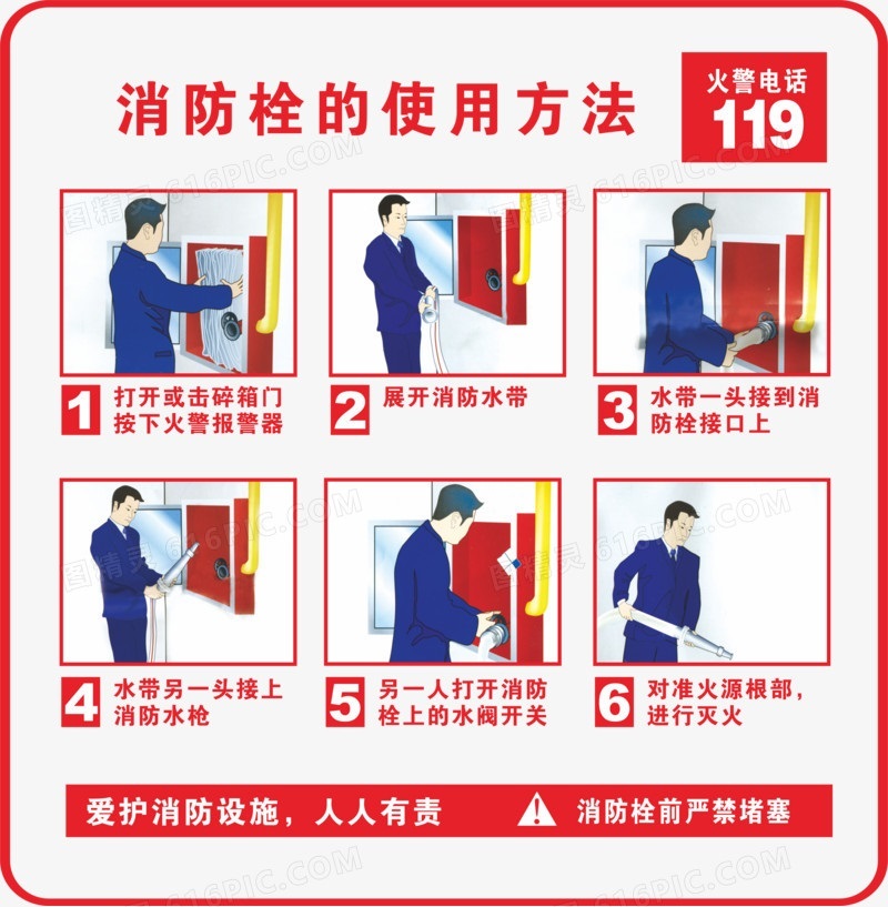 (1)打開消火栓門,按下內(nèi)部火警按鈕(按鈕是報警和啟動消防泵的)?! ?br />(2)一人接好槍頭和水帶奔向起火點?! ?br />(3)另一人接好水帶和閥門口?! ?br />(4)逆時針打開閥門水噴出即可。注:電起火要確定切斷電源。