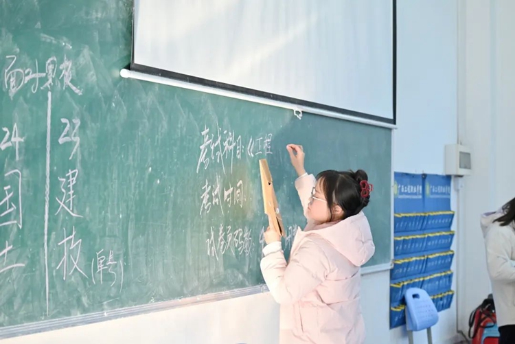 圖為監(jiān)考教師將考試科目、考試時(shí)間和試卷頁碼書寫到黑板上