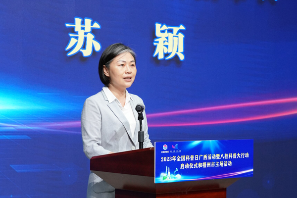 蘇穎在啟動儀式上致辭,向出席本次活動的來賓表示熱烈歡迎。她表示,梧州市委、市政府高度重視科技創(chuàng)新和科學(xué)普及,以科技賦能助力經(jīng)濟社會和特色產(chǎn)業(yè)高質(zhì)量發(fā)展,近年來,創(chuàng)新建成大聯(lián)合、大協(xié)作、大科普工作機制,多渠道、多方式向群眾普及科學(xué)知識、倡導(dǎo)科學(xué)方法、傳播科學(xué)思想、弘揚科學(xué)精神。當前,梧州市經(jīng)濟總體持續(xù)向好,正朝著打造“一極三城”、建設(shè)“四個梧州”的宏偉目標奮斗。梧州將以此次活動為契機,進一步號召全市各級各部門和廣大群眾積極行動起來,主動參與科普活動,不斷推動科普事業(yè)高質(zhì)量發(fā)展和全民科學(xué)素質(zhì)水平大幅提升。