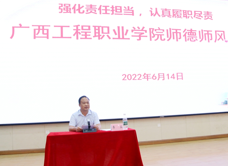為進(jìn)一步推進(jìn)學(xué)校師德師風(fēng)建設(shè),落實立德樹人根本任務(wù),著力建設(shè)一支政治素質(zhì)過硬、作風(fēng)優(yōu)良、品德高尚、能力過硬的教師隊伍,6月14日下午,廣西工程職業(yè)學(xué)院“強化責(zé)任擔(dān)當(dāng) 認(rèn)真履職盡責(zé)”師德師風(fēng)培訓(xùn)會在圖文信息大樓學(xué)術(shù)報告廳舉行。紀(jì)委書記、副校長彭高彬作了題為《堅持立德樹人 做四有好老師》的專題培訓(xùn)。學(xué)校黨政領(lǐng)導(dǎo)班子出席培訓(xùn)會,全體教職工參會,會議由黨委副書記黃秋霞主持。