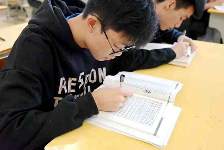 同學(xué)們?cè)谡n堂上認(rèn)真書寫廉潔書法