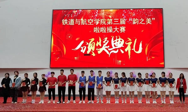 為豐富校園文化,不斷提高同學(xué)們的綜合素質(zhì),營(yíng)造和諧向上的校園文化氛圍,我校鐵道與航空學(xué)院于2020年12月25日在體育館舉辦第三屆“韻之美”大學(xué)生啦啦操比賽。學(xué)校副校長(zhǎng)彭高彬,鐵道與航空學(xué)院副院長(zhǎng)覃清香、辦公室主任羅丹出席本次大賽。學(xué)工處副處長(zhǎng)吳發(fā)德,形體課專業(yè)教師謝錫潔、王珺珊、梁永艷等7位老師應(yīng)邀擔(dān)任大賽評(píng)委。本次啦啦操大賽的參賽隊(duì)員主要來自鐵道與航空學(xué)院和教育學(xué)院的11支隊(duì)伍。