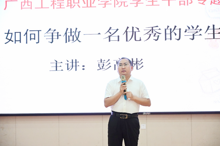 紀(jì)委書記、副校長彭高彬副教授作題為《如何做一名優(yōu)秀的學(xué)生干部》的專題培訓(xùn)。彭高彬副校長在培訓(xùn)中指出學(xué)生干部要明確自己的角色和定位,學(xué)生干部首先是學(xué)生,其次是干部,最后是學(xué)生干部。強(qiáng)調(diào)全體學(xué)生干部要正確理解“學(xué)生干部”的內(nèi)涵和明確“學(xué)生干部”角色定位,牢固樹立為同學(xué)服務(wù)、為班級服務(wù)、為二級學(xué)院服務(wù)和為學(xué)校服務(wù)的理念,增強(qiáng)公仆意識(shí)、開拓意識(shí)、參與意識(shí),工作中做到“三性”(主動(dòng)性、積極性、創(chuàng)造性) ,“三高”(高標(biāo)準(zhǔn)、高要求、高效率) ,“三心”(忠心、細(xì)心、耐心),充分發(fā)揮模范帶頭、橋梁紐帶作用,爭做學(xué)習(xí)的楷模、守紀(jì)的楷模、鍛煉身體的楷模和參加學(xué)校各項(xiàng)活動(dòng)的楷模。