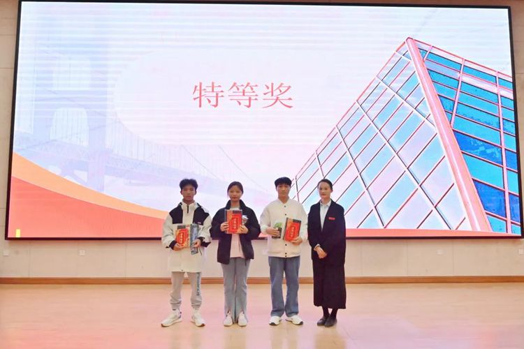 土木工程學(xué)院黨總支部副書記朱海玲為獲得特等獎(jiǎng)的同學(xué)頒獎(jiǎng)