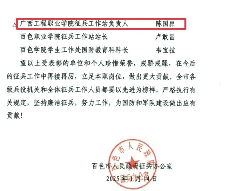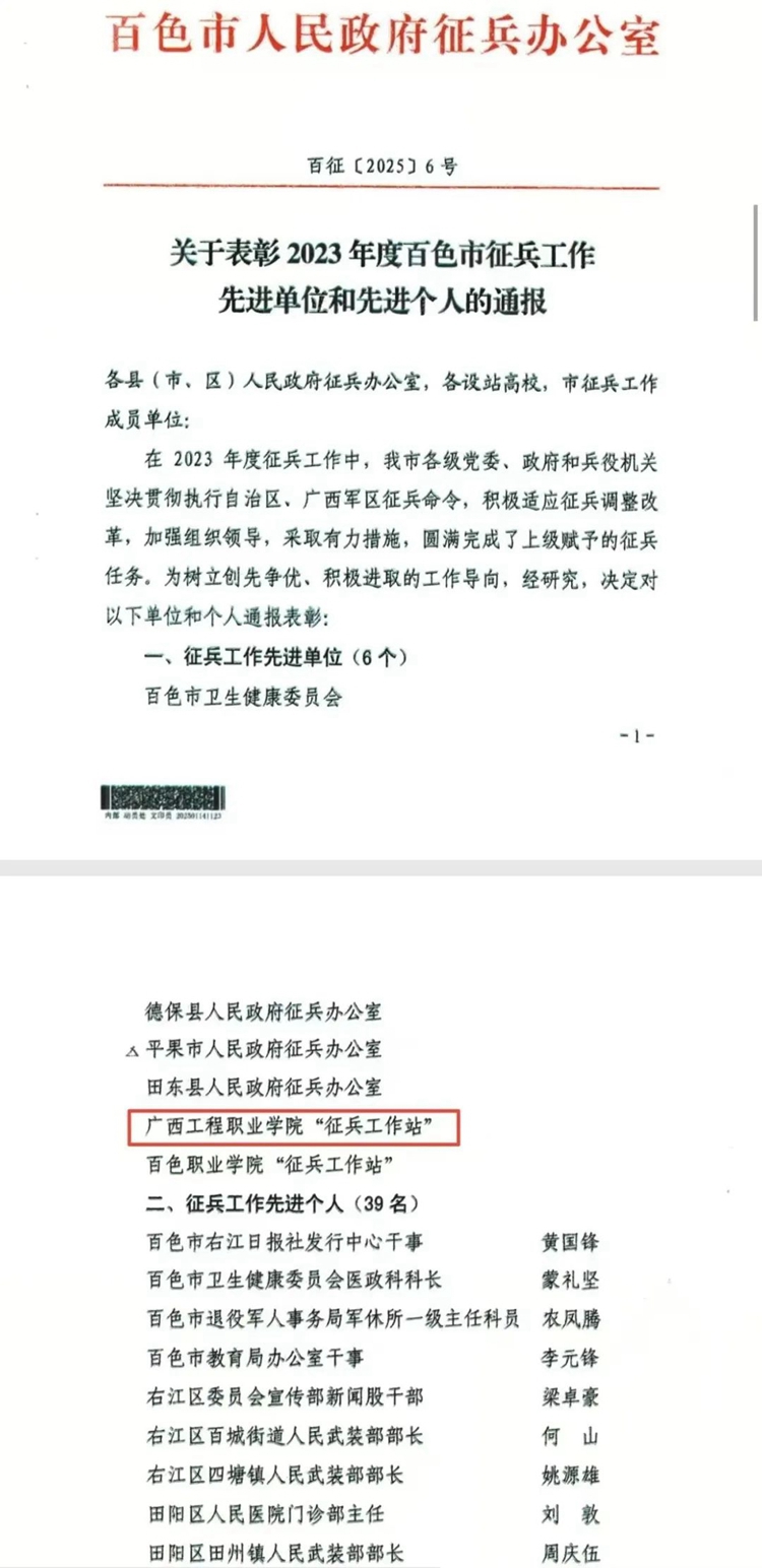 近日,百色市人民政府征兵辦公室公布了《關于表彰2023年度百色市征兵工作先進單位和先進個人的通報》(百征〔2025〕6號),對全市2023年征兵工作先進單位和先進個人進行通報表彰,廣西工程職業(yè)學院被評為2023年度征兵工作先進單位、學校征兵工作站負責人陳國昇老師被評為“征兵工作先進個人” 。