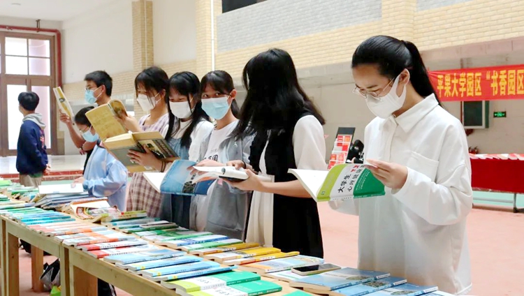 在圖文信息大樓一樓大廳,圖書(shū)館展出了紅色讀物、經(jīng)典文學(xué)作品、生態(tài)文明類書(shū)刊等,吸引眾多學(xué)生前來(lái)駐足觀看閱讀。同學(xué)們靜心閱讀,品味書(shū)香,營(yíng)造了濃厚的讀書(shū)氛圍。