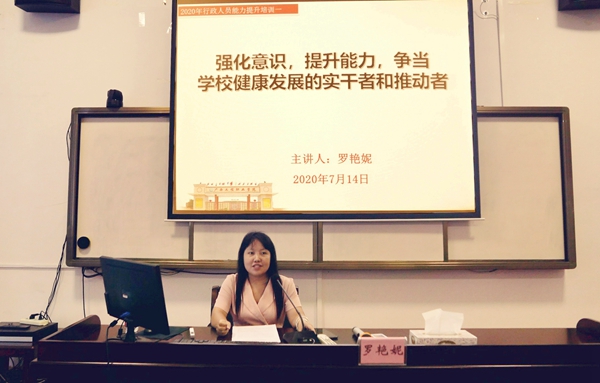 7月14日下午,我校2020年行政人員能力提升培訓(xùn)第一期專題培訓(xùn)在圖書館學(xué)術(shù)報告廳舉行,學(xué)校副校長羅艷妮作題為《強化意識,提升能力,爭當(dāng)學(xué)校健康發(fā)展的實干者和推動者》的專題培訓(xùn),校長辦公室負責(zé)人及其他校屬單位負責(zé)人等參加培訓(xùn)。