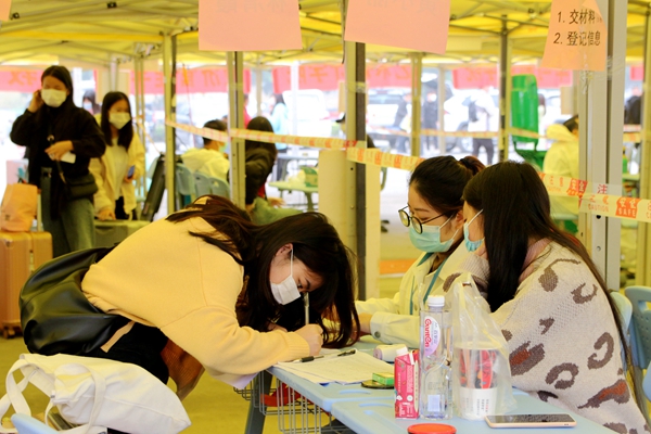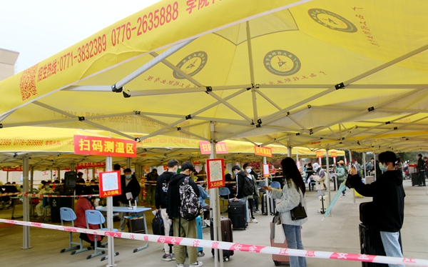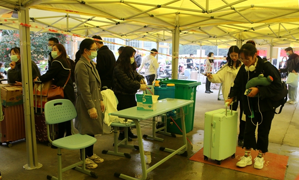 學(xué)生返校當天,學(xué)校在校門口搭建了臨時帳篷,劃分了“汽車停放區(qū)”“排隊等候區(qū)”“掃碼區(qū)”“體溫測量區(qū)”“行李消殺區(qū)”“返校資料審核區(qū)”等多個區(qū)域,并開通了多條通道方便學(xué)生有序返校。學(xué)生配合疫情防控查驗,有序排隊,進行體溫篩查,出示健康“綠碼”,進行行李消殺和核驗返校材料信息無誤后,簽到注冊、上交相關(guān)材料,安全進入校園。學(xué)校還貼心安排了觀光車,幫助學(xué)生運送行李至宿舍樓。