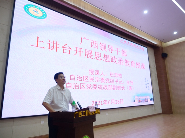6月28日下午,我校在圖文信息大樓學術(shù)報告廳舉行了2021年廣西領(lǐng)導干部上講臺開展思想政治教育授予課報告會。自治區(qū)民宗委黨組書記、主任、自治區(qū)黨委統(tǒng)戰(zhàn)部副部長(兼)班忠柏同志到我校作了主題為《鑄牢中華民族共同體意識,建設(shè)中華民族共有精神家園》的專題報告。學校黨委書記呂偉斌主持報告會,在家的校領(lǐng)導、各部門負責人、各黨支部書記、全體師生黨員、學生代表共400多人參加了報告會。