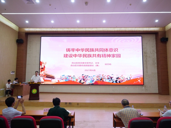 班書記重點圍繞大力弘揚中華民族偉大精神,持續(xù)增進對偉大祖國,中華民族、中華文化、中國共產(chǎn)黨、中國特色社會主義的認同;繼承和發(fā)揚廣西民族團結(jié)的優(yōu)良傳統(tǒng),持續(xù)發(fā)揮好全國民族團結(jié)進步示范區(qū)的示范帶動作用;堅決抵御宗教滲透,牢牢守住高校意識形態(tài)陣地等三個方面內(nèi)容進行系統(tǒng)的授課。強調(diào)指出,當前我國正處于“兩個一百年”奮斗目標的歷史交匯期,奮進全面建設(shè)社會主義現(xiàn)代化國家新征程的新發(fā)展階段,必須堅持習近平新時代中國特色社會主義思想為指導,扎實開展好黨史學習教育,教育、引導人們牢固樹立正確的歷史觀、民族觀、國家觀、文化觀、宗教觀,把歷史當成最好的老師,從歷史中吸取奮進的智慧和力量;要正確認識民族問題和宗教問題,大力加強民族團結(jié),促進各民族像石榴籽一樣緊緊擁抱在一起;要有正確的國家觀念、憲法意識和公民意識,愛黨愛國;要充分吮吸中華民族五千年來的優(yōu)秀傳統(tǒng)文化養(yǎng)分,弘揚革命文化和社會主義先進文化,筑牢社會主義核心價值觀,自覺鑄牢中華民族共同體意識。