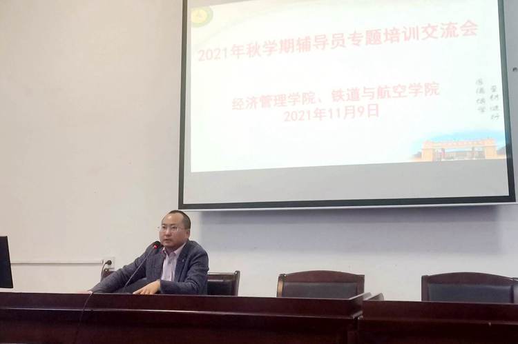 為提升我校思想政治工作質(zhì)量和輔導(dǎo)員隊(duì)伍建設(shè)水平,培養(yǎng)輔導(dǎo)員隊(duì)伍的職業(yè)榮譽(yù)感與歸屬感,增強(qiáng)輔導(dǎo)員的團(tuán)隊(duì)協(xié)作意識(shí),推動(dòng)輔導(dǎo)員隊(duì)伍專(zhuān)業(yè)化、職業(yè)化發(fā)展,11月9日下午,經(jīng)濟(jì)管理學(xué)院、鐵道與航空管理學(xué)院在圖書(shū)館學(xué)術(shù)報(bào)告廳聯(lián)合召開(kāi)2021年秋學(xué)期輔導(dǎo)員專(zhuān)題培訓(xùn)交流會(huì),學(xué)校黨委委員、副校長(zhǎng)彭高彬參與并指導(dǎo)此次交流會(huì),兩個(gè)二級(jí)學(xué)院的黨支部書(shū)記、分團(tuán)委書(shū)記、全體輔導(dǎo)員參加交流會(huì)。