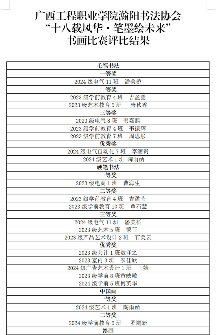 廣西工程職業(yè)學(xué)院2025年 “十八載風(fēng)華?筆墨繪未來”書畫比賽的舉辦,為師生提供了一個(gè)展示才華、交流學(xué)習(xí)的平臺(tái),營造了積極向上、團(tuán)結(jié)奮進(jìn)的濃厚校園文化氛圍,進(jìn)一步強(qiáng)化了校園美育的滋養(yǎng),實(shí)現(xiàn)以優(yōu)秀作品教育人、鼓舞人的功能,激發(fā)師生愛校榮校熱情。