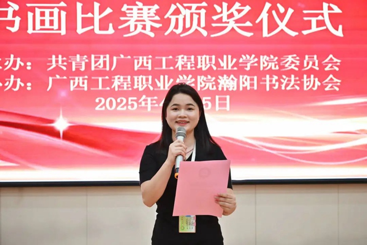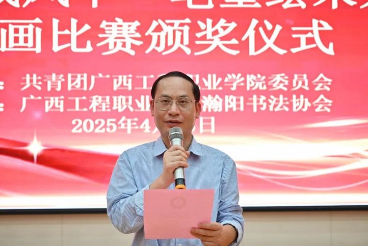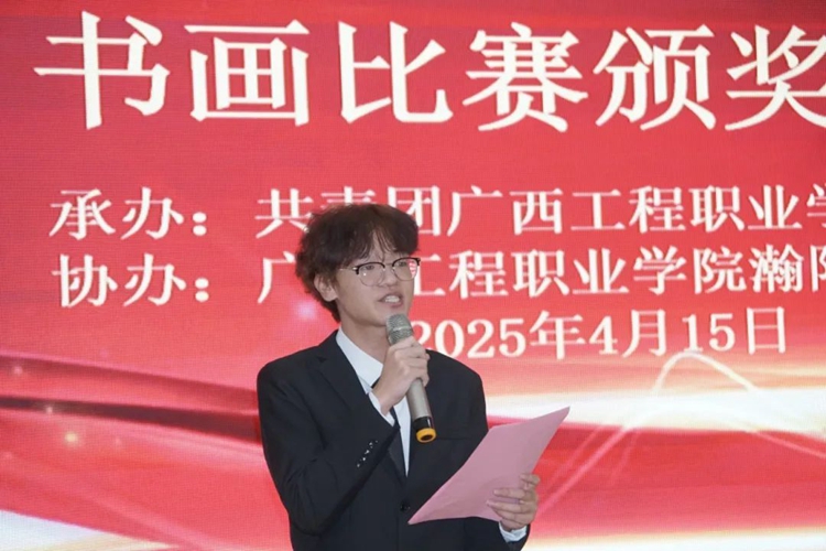 副校長黃德偉致辭,他指出,學(xué)校從建校之初到如今的桃李芬芳,始終秉承“厚德博學(xué),至材健行”的校訓(xùn)精神,在傳承中創(chuàng)新,在耕耘中收獲。此次校慶書畫比賽的成功舉辦,既是對(duì)學(xué)校十八年風(fēng)雨歷程的深情禮贊,又展現(xiàn)了同學(xué)們的藝術(shù)才華和精神風(fēng)貌。他鼓勵(lì)同學(xué)們通過藝術(shù)鑒賞與創(chuàng)作不斷提升個(gè)人文化修養(yǎng)、美育素養(yǎng),積極參與校園文化建設(shè),共同書寫廣西工程職業(yè)學(xué)院新篇章。