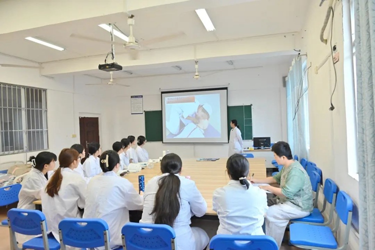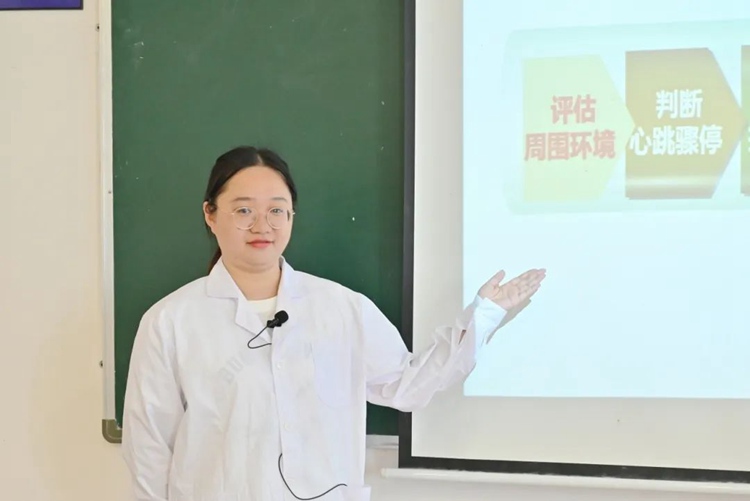 黃雯老師向同學(xué)們詳細講解了心肺復(fù)蘇術(shù)的急救知識,并演示了心肺復(fù)蘇術(shù)急救法的具體操作細節(jié),告訴同學(xué)們?nèi)绾巫钣行У乩?ldquo;黃金時間”搶救生命,進一步提升了同學(xué)們的緊急救護能力。