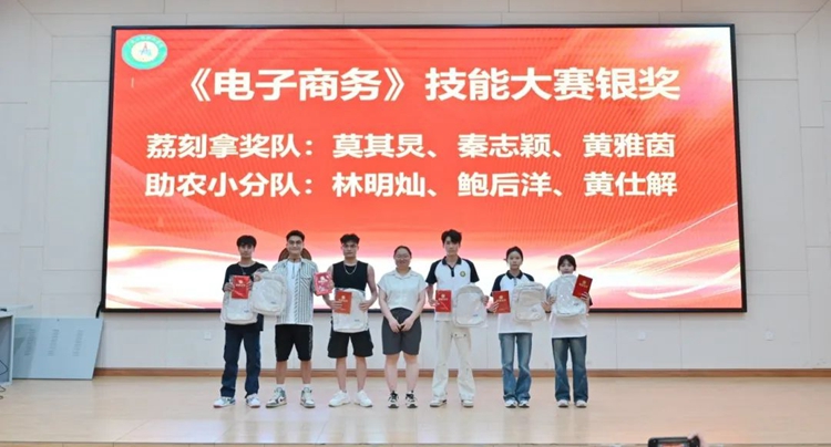 圖為財會教研室主任石娜為荔刻拿獎隊、助農(nóng)小分隊頒發(fā)銀獎榮譽證書和獎品