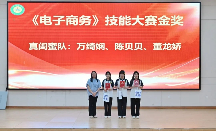 圖為經(jīng)濟管理學院黨支部副書記潘翠萍為真閨蜜隊頒發(fā)金獎榮譽證書和獎品