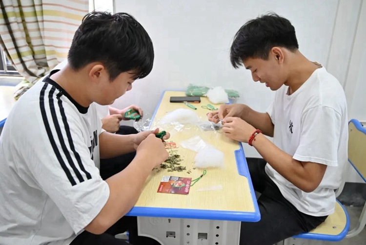 同學(xué)們興致盎然地縫制著寓意驅(qū)邪避疫的香包,一針一線傳遞著安康祝福。