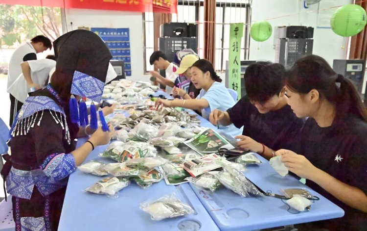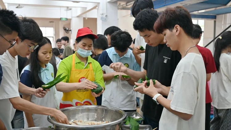 在多功能餐廳二樓,師生們齊聚一堂,親手體驗包粽子的樂趣。在經(jīng)驗豐富的老師或同學(xué)的指導(dǎo)下,大家捋粽葉、填糯米、加餡料、裹緊實、扎線繩,一道道工序有條不紊。