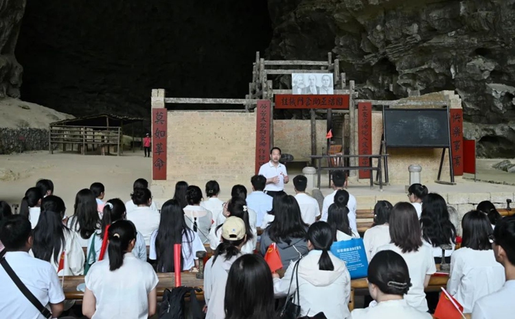 在列寧巖里,講解員向大家詳細講解了韋拔群同志在列寧巖中傳播革命思想、培育革命干部、加強革命作風(fēng)的光輝歷史,一排排整齊的課桌椅,一張張對稱的學(xué)員床……正是他們追求革命理想的最好見證。