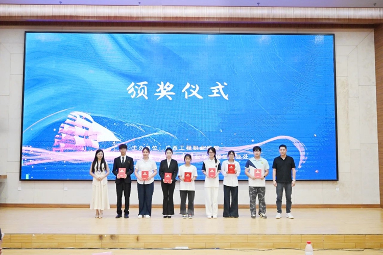 圖為廣西工程職業(yè)學(xué)院招生就業(yè)處副處長陳麗燕為學(xué)生頒發(fā)二等獎