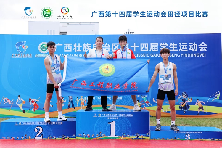 圖為廣西壯族自治區(qū)第十四屆學(xué)生運(yùn)動會高職高專組男子跳高比賽頒獎儀式,工程學(xué)子莫其炅同學(xué)榮獲跳高比賽冠軍并打破賽事記錄。