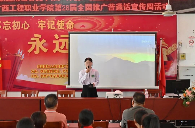廣西工程職業(yè)學(xué)院學(xué)生代表李奇鮮、莫代總還帶來了精彩的朗誦表演。兩人身著整齊服裝,精神飽滿地站上舞臺,以標(biāo)準(zhǔn)流利的普通話朗誦經(jīng)典篇目,語調(diào)時而激昂、時而舒緩,聲情并茂的演繹極具感染力,臺下不時響起陣陣熱烈掌聲。