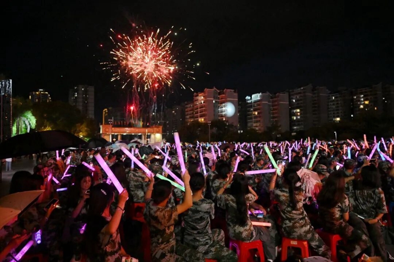 話音剛落,幾聲清脆的聲響劃破夜空,絢爛的煙火驟然綻放。金色、銀色、紅色的火花在墨色夜幕中交織,時而如流星般劃過天際,留下璀璨軌跡;時而似花朵般盡情舒展,綻放層層絢爛,將整個校園映照得宛如夢幻仙境?,F(xiàn)場的新生們紛紛舉起手機(jī),迫不及待記錄下這震撼又浪漫的瞬間,歡呼聲、驚嘆聲此起彼伏,瞬間點燃了全場的熱烈氛圍,也為這場晚會拉開了極具儀式感的序幕。