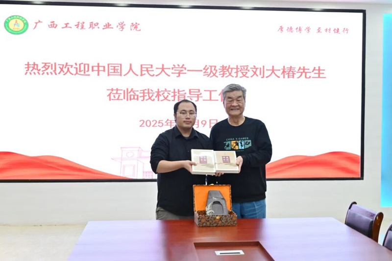 副校長李明澤代表學校向劉大椿先生贈送具有右江地域特色的非遺紀念品,衷心感謝劉大椿先生對學校發(fā)展的悉心指導。劉大椿先生回贈親筆簽名的《西學東漸》《師夷長技》兩部專著,衷心祝愿廣西工程職業(yè)學院朝著“思想鑄校,科技興校,人才強校”的目標蒸蒸日上,為區(qū)域經(jīng)濟社會發(fā)展貢獻更大力量。
