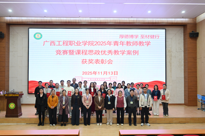 為深入落實立德樹人根本任務(wù),持續(xù)推進課程思政建設(shè)走深走實,全面提升青年教師教學(xué)能力與育人水平,表彰先進典型、凝聚奮進力量,11 月 13 日下午,廣西工程職業(yè)學(xué)院 2025 年青年教師教學(xué)競賽暨課程思政優(yōu)秀教學(xué)案例評選獲獎表彰會在圖文信息中心一樓學(xué)術(shù)報告廳舉行。學(xué)校黨委副書記黃秋霞、教務(wù)處處長黃香琴、經(jīng)濟管理學(xué)院院長覃清香、藝術(shù)設(shè)計學(xué)院院長覃鳳姣、教育學(xué)院院長胡星萍、汽車與機電學(xué)院院長楊竟、馬克思主義學(xué)院副院長李麗詩、鐵道與航空學(xué)院副院長廖嬌、土木工程學(xué)院副院長陳春任出席大會,全體任課教師參加會議。表彰會由教務(wù)處科長覃海梅主持。