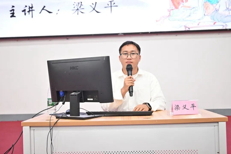 圖為學(xué)生工作處科長梁義平作《文明禮儀伴我行》專題教育