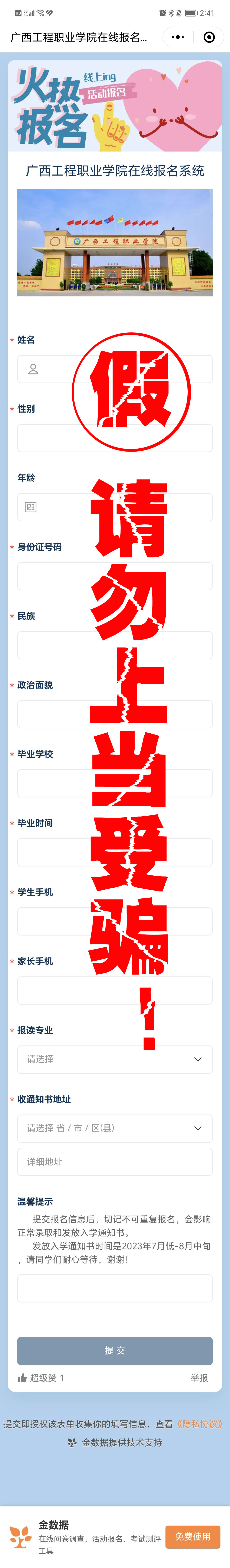 特別提醒,我校2023年無單招對口征集計(jì)劃,學(xué)生和家長在咨詢升學(xué)過程中,如遇不法分子提出收取定位費(fèi)、書費(fèi)等保證金以保證升學(xué)就讀的,請學(xué)生和家長及時報警。網(wǎng)絡(luò)報警電話:96110。