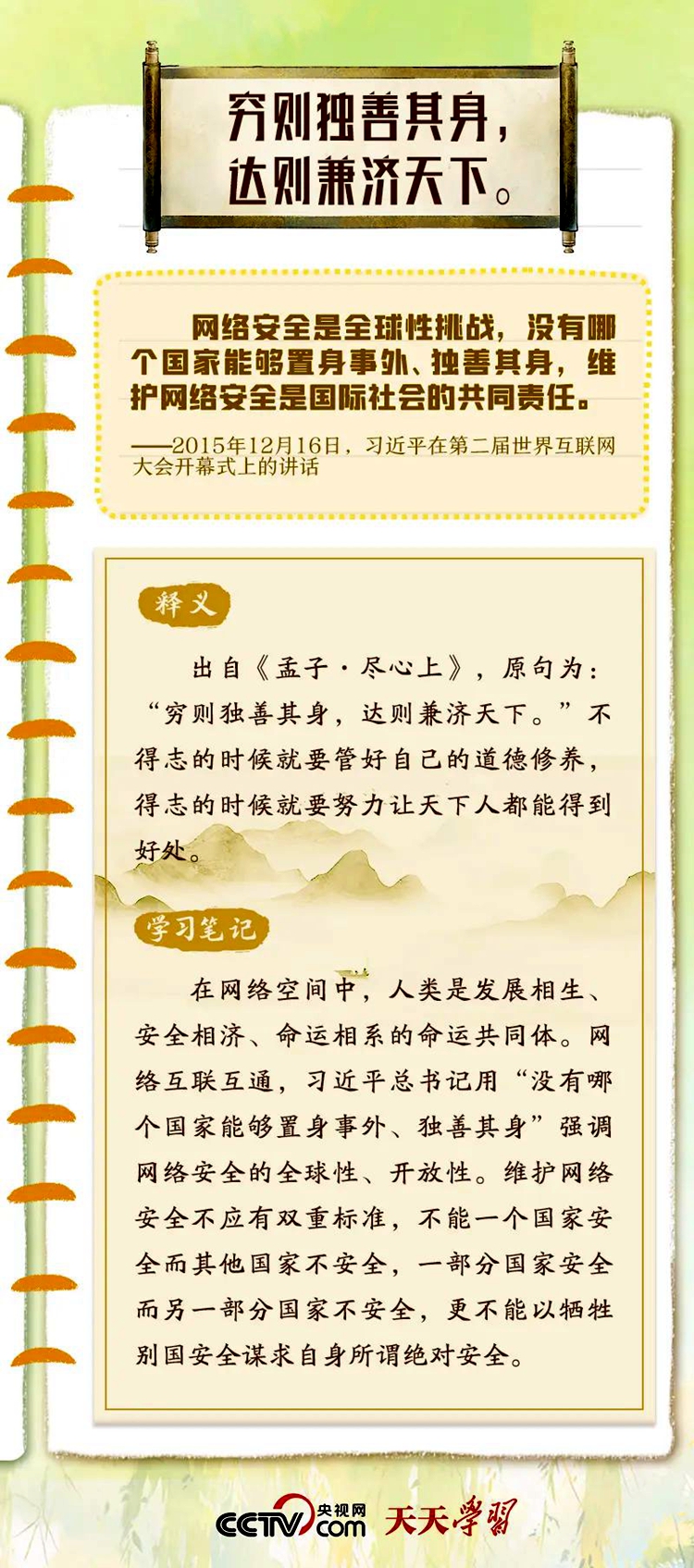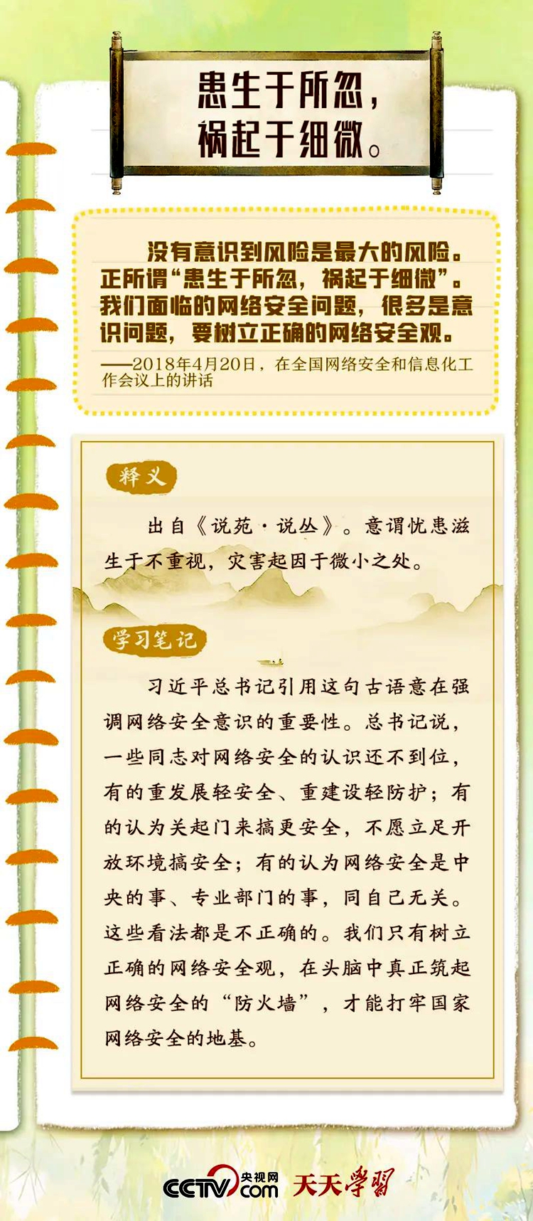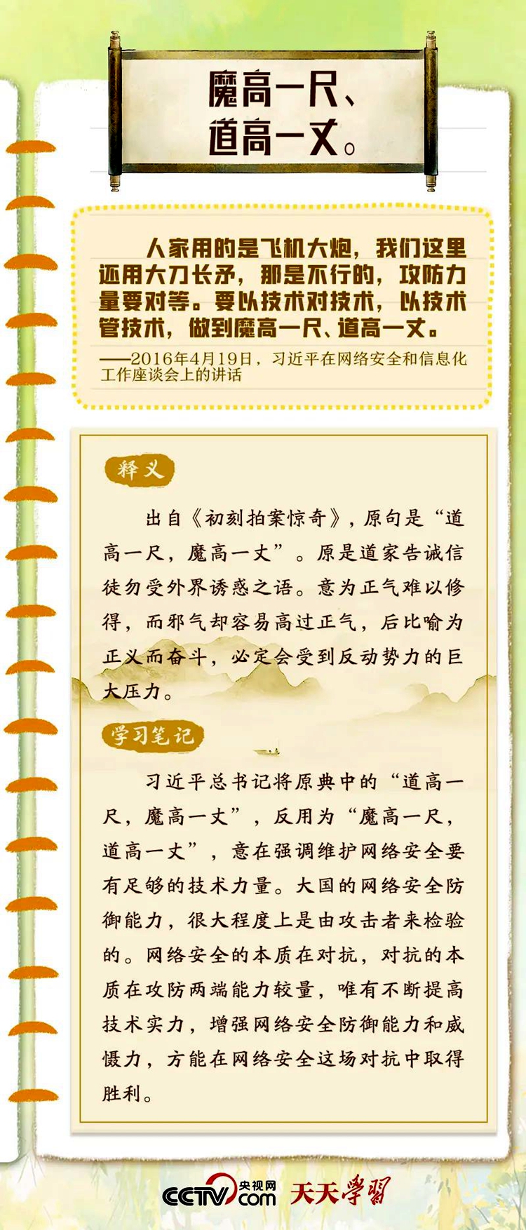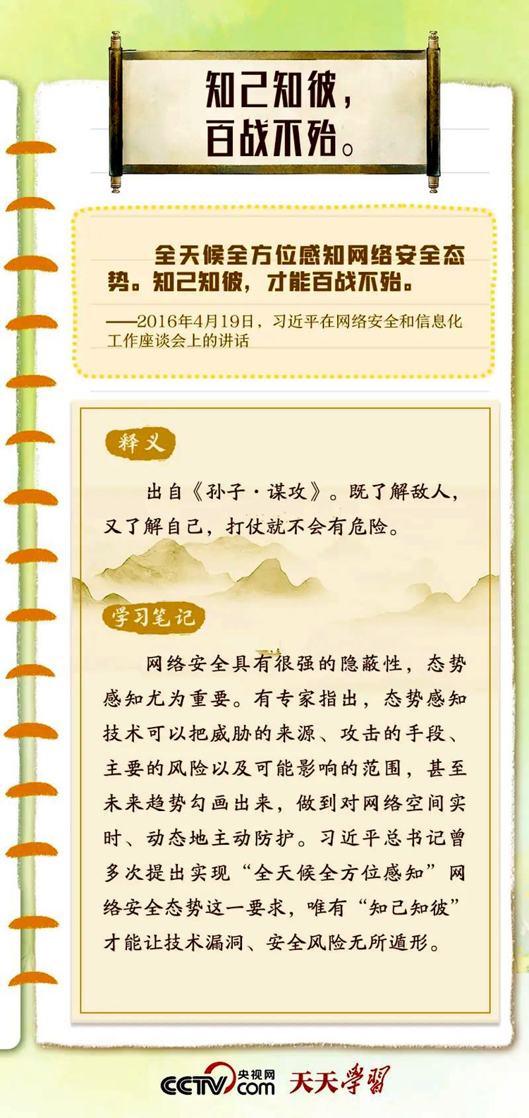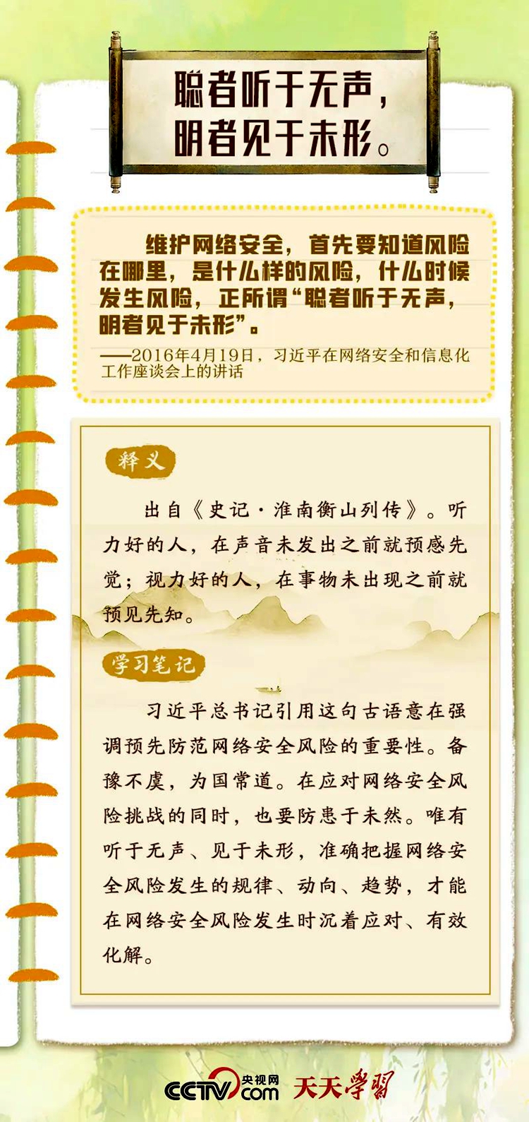 習(xí)近平總書記重視網(wǎng)絡(luò)安全工作,曾多次在講話中以典明理,深刻闡釋網(wǎng)絡(luò)安全工作的重要意義。“網(wǎng)絡(luò)安全宣傳周”到來之際,央視網(wǎng)《天天學(xué)習(xí)》特梳理總書記關(guān)于網(wǎng)絡(luò)安全的用典,與您一起學(xué)習(xí)領(lǐng)悟。