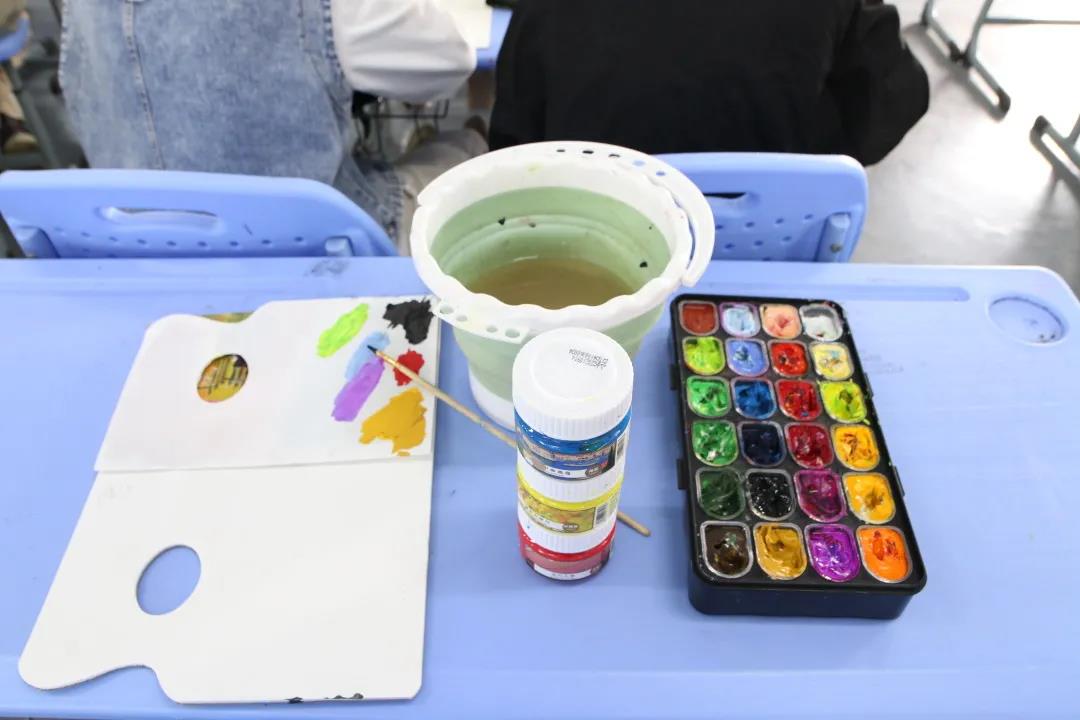 各種顏色的顏料水彩、調(diào)色盤、畫筆、