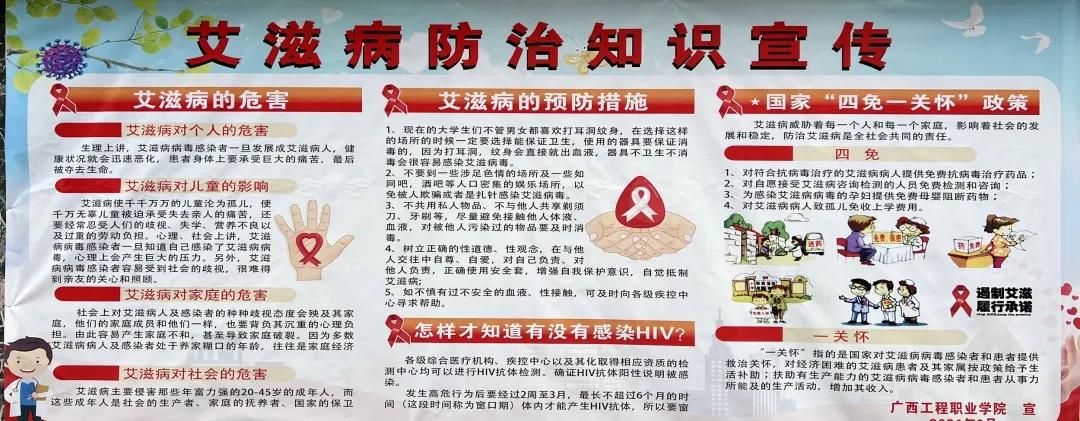 通過展板、宣傳欄知識宣傳及發(fā)放宣傳手冊,告訴同學(xué)們?nèi)绾斡行ьA(yù)防艾滋病、識毒禁毒,珍愛生命,遠離毒品。