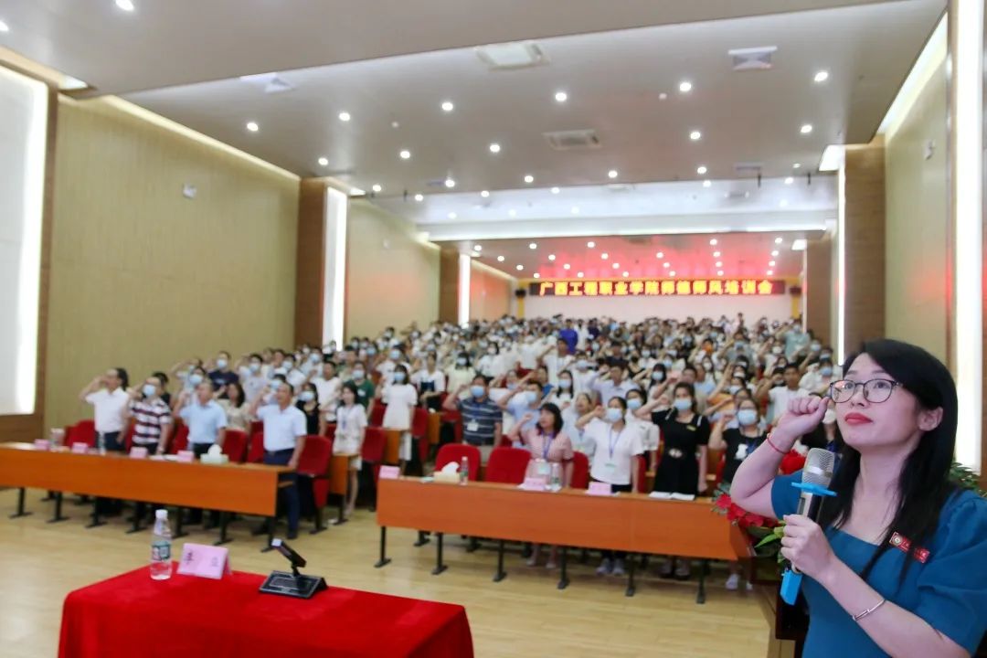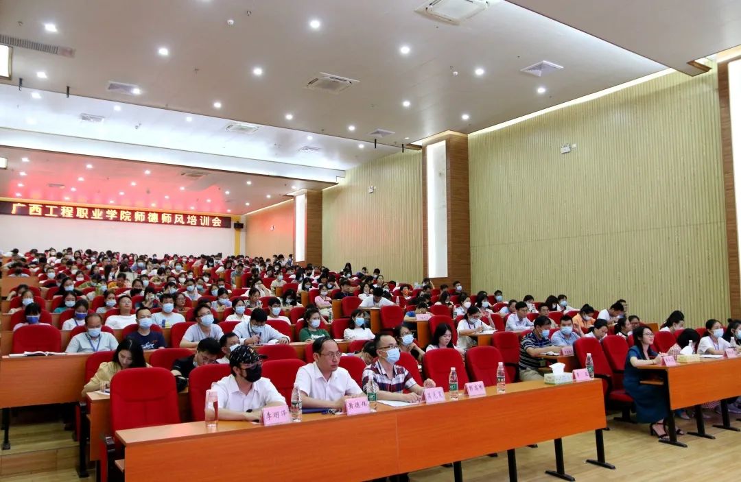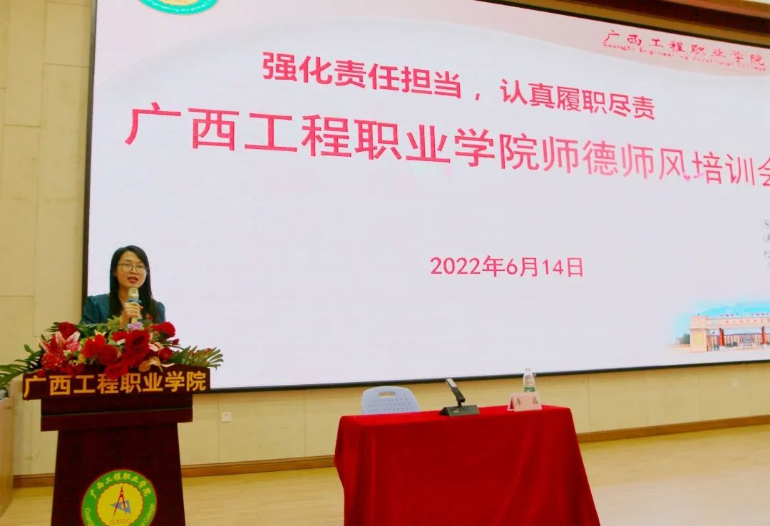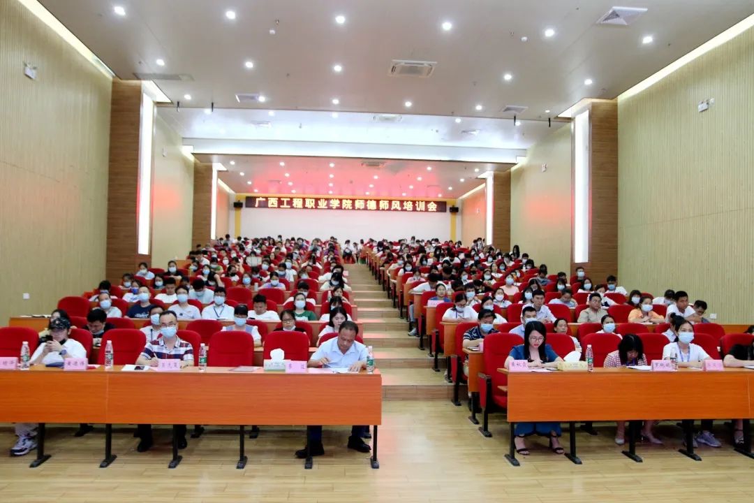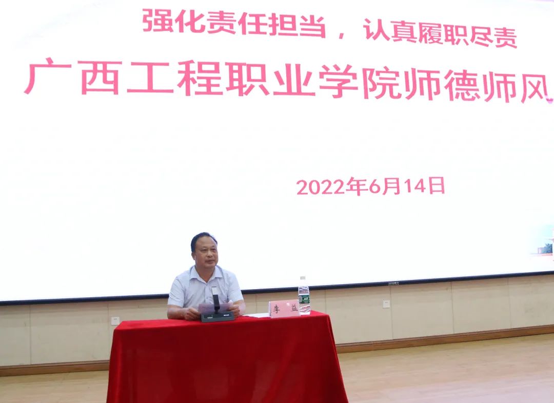 為進一步推進學校師德師風建設,落實立德樹人根本任務,著力建設一支政治素質過硬、作風優(yōu)良、品德高尚、能力過硬的教師隊伍,6月14日下午,廣西工程職業(yè)學院“強化責任擔當 認真履職盡責”師德師風培訓會在圖文信息大樓學術報告廳舉行。紀委書記、副校長彭高彬作了題為“堅持立德樹人 做四有好老師”的專題培訓。學校黨政領導班子出席培訓會,全體教職工參會,會議由黨委副書記黃秋霞主持。