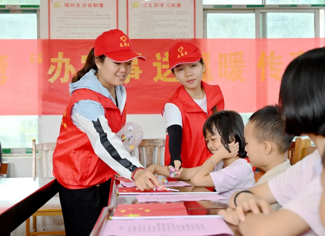 實踐團、服務(wù)團成員在三合村黨群服務(wù)中心開展了“童心港灣‘辦實事 送溫暖 傳真情’”主題活動,給留守兒童們送去關(guān)愛與溫暖。以《紅星歌》《我是中國娃》為主題,教留守兒童們唱歌、朗誦,慶祝今年新中國成立75周年,增強孩子們的愛國意識;同時還給孩子們送上五顏六色的文具、水杯、雨傘、糖果、筆記本等愛心紀念品,讓留守兒童感受社會大學(xué)生志愿者對他們的關(guān)愛。“紅星閃閃放光彩,紅星燦燦暖胸懷……”“……不管長多大,不管走到哪,中國都是我的家,我是中國娃”,一句句歌聲,一句句朗誦,都回蕩在教室中,整個活動充滿歡聲笑語。